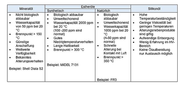 Zudem hat die Feststoffisolation die Aufgabe, die mechanische Festigkeit der Wicklung zu gewährleisten. Für die Flüssigisolation können verschiedene Arten von Ölen eingesetzt werden. Es gibt mineralische Öl sowie synthetische und natürliche Esther und Silikonöle.