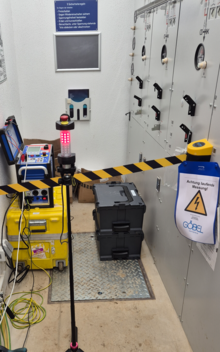 Ein weiterer kritischer Punkt ist die Bereitstellung der Einspeisestrecke für den Prüfstrom. Wir verwenden für die Messung die frequenzselektive Strom-Spannungs-Methode mit dem OMICRON CPC100 und CU1. Der Prüfstrom, der den Fehlerfall simuliert, wird dabei nicht bei Nennfrequenz von 50 Hz, sondern bei 30 Hz und 70 Hz eingespeist Dadurch sind die Störeinflüsse gering und die benötigte Leistung der Stromquelle ist niedriger. Für Messungen nach EN 50522 muss der Strom jedoch, je nach Größe der Schaltanlage (Umspannwerk) kilometerweit zum Gegenerder (Umspannwerk) eingespeist werden. Dies wird über vorhandene Freileitungen oder Kabel der örtlichen Netzbetreiber realisiert. Die Einspeisung erfolgt über einen direkten Anschluss auf die Freileitung, um die Sicherheit im Falle eines fernen Blitzeinschlags oder Fehlers auf der Leitung während der Messung zu gewährleisten wird der Messanschluss über die sogenannte GroundingBox( Kurzschlussfestigkeit bis 35 kA) vorgenommen. Es sind zusätzliche Abstimmungen notwendig und die Messung ist damit auch von der Abschaltplanung der vorgesehenen Einspeisestrecke abhängig. Es laufen parallel folgende organisatorischen Prozesse ab: