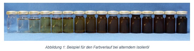 Die Farbe des Isolieröls wird nach der ISO 2049 (ASTM Scala) für Mineralöle bestimmt. Je nach Alter und Belastung (z. B. durch Lichtbögen beim Umschalten) verfärbt sich das Öl. Neues Isolieröl sollte weiß bis hellgelb, klar und frei von jeglichen Schwebstoffen sein. Bei der Farbskala gilt ein Wert ≤ 6 als in Ordnung. Insbesondere das Öl im Lastumschalter zeigt häufig schnell starke Verfärbungen an, da hier das Öl durch die Lichtbogenbildung beim Umschalten sehr stark belastet wird.