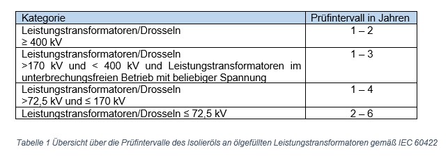 Die Prüfintervalle sind in der IEC 60422 (VDE 0370-2) beschrieben und richten sich nach der Art des Betriebsmittels und in welcher Spannungsebene dieses eingesetzt wird. Für Transformatoren sind hier von insgesamt acht Kategorien nur vier relevant. Die nachfolgende Tabelle gibt Ihnen einen Überblick über die empfohlenen Intervalle für die Standardölanalyse.