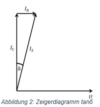 Der dielektrische Verlustfaktor beschreibt die Verluste, welche über das Öl als Dielektrikum zwischen den Wicklungen untereinander und der Erde entstehen. Am Beispiel der Wicklungen gegen Erde bilden diese eine Kapazität, bei der das Öl das Dielektrikum ist. Die kapazitiven Ströme haben eine ideale Phasenverschiebung von 90° zu der angelegten Wechselspannung von 50 Hz. Die ohmschen Verluste, zum Beispiel durch eine hohen Feuchtigkeitsgehalt im Öl, verzerren diesen Winkel nun. Dieser Winkel (δ) kann viel genauer als der Absolute Strom bestimmt werden und wird durch die Berechnung als Tangens deutlicher lesbar. Neben der Feuchtigkeit haben auch die Zersetzungsprodukte bei der Alterung des Öls eine Einfluss auf diesen Wert. Der dielektrische Verlustfaktor wird bei 90 °C und 50 Hz bestimmt und sollte ≤ 0,5 sein. Der dielektrische Verlustfaktor wird auch in anderen Bereichen, wie bei der Zustandsbewertung von Durchführungen, eingesetzt.